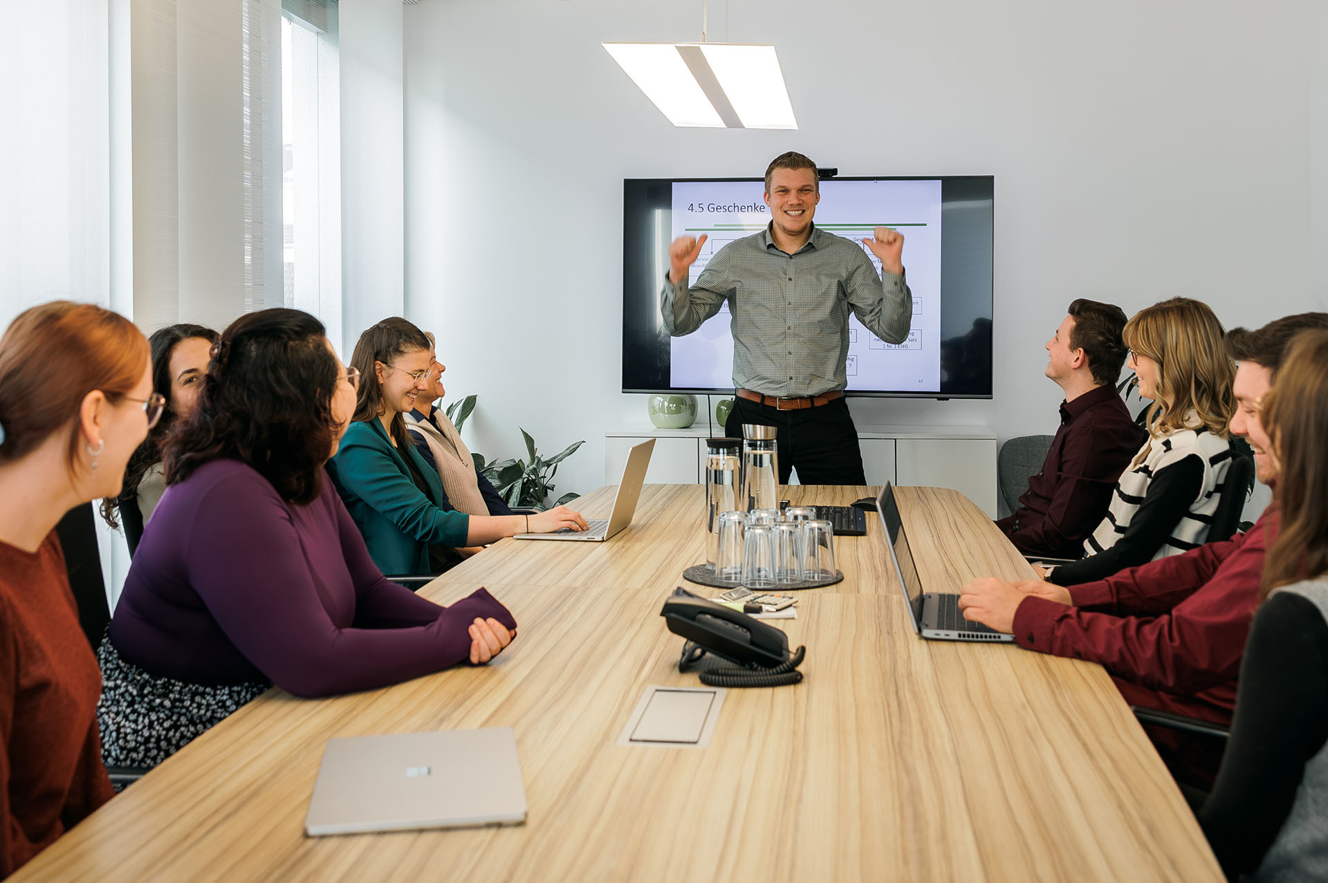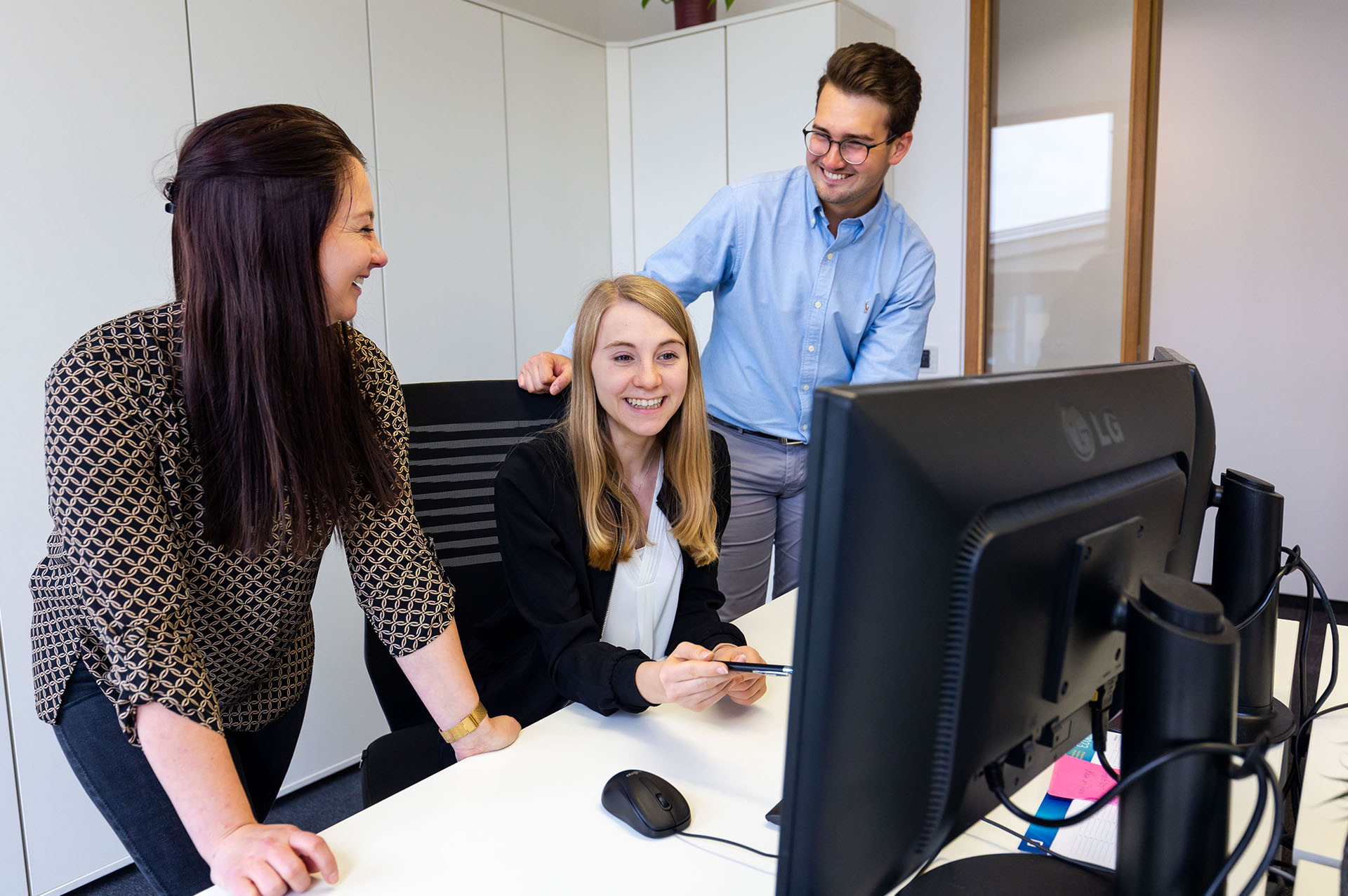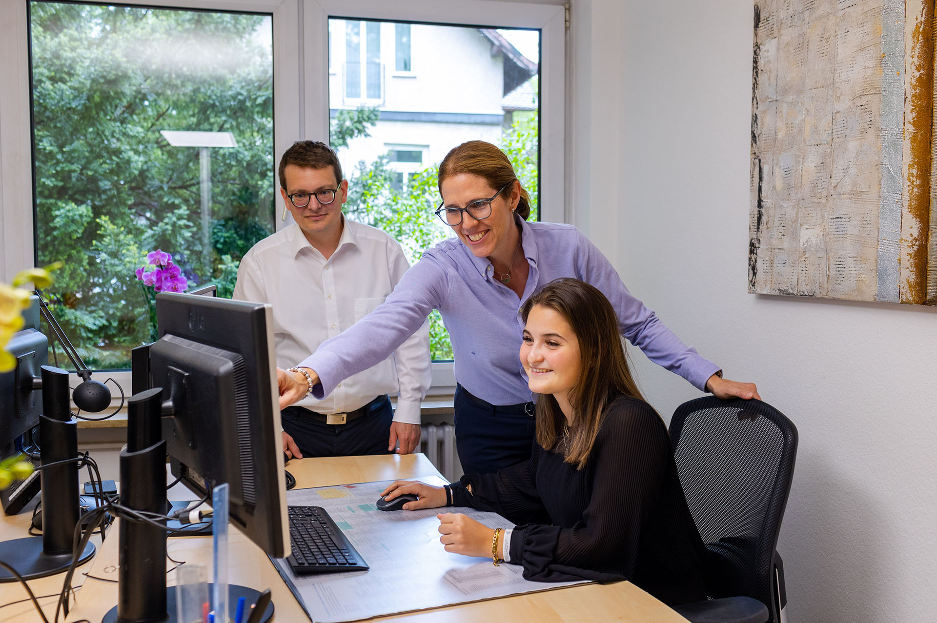Kurze Wege dank flacher Hierarchien und offener Türen. Regelmäßiger Austausch im Team und mit den Chefs.