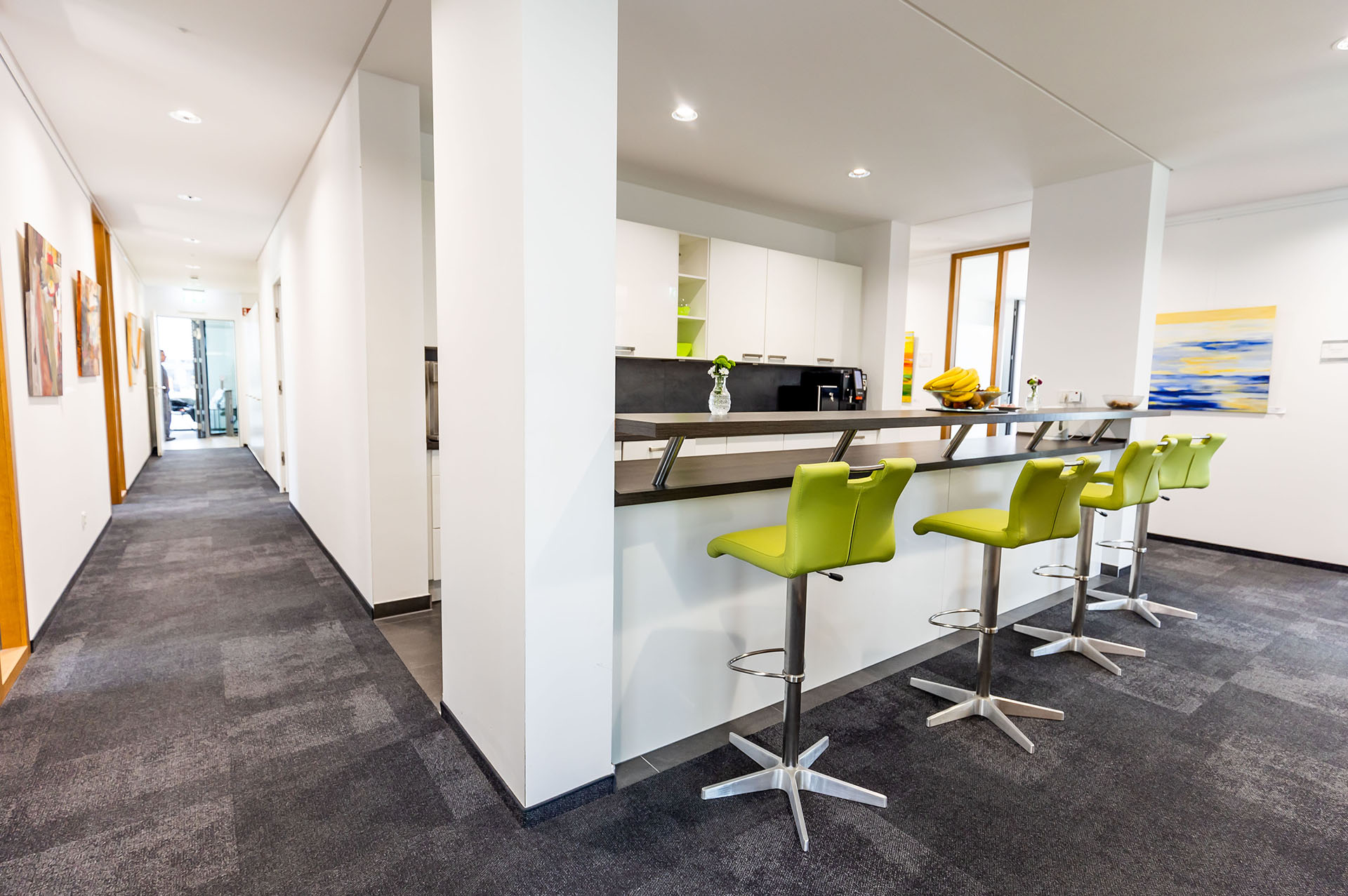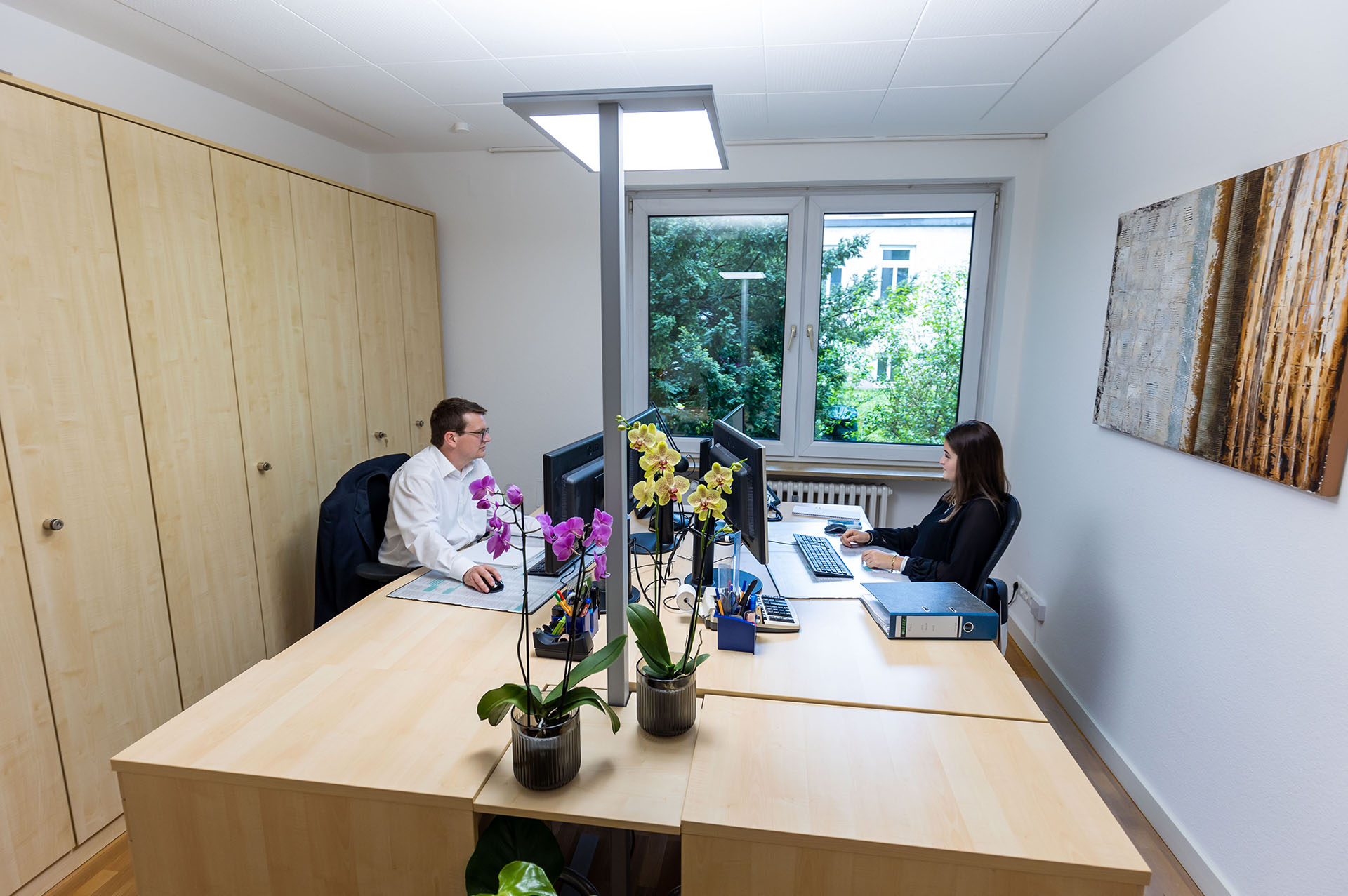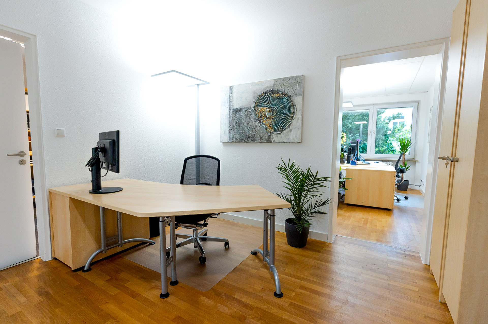 Dich erwarten helle und hochwertige Büroräume mit ergonomischen Büromöbeln und bester Ausstattung. Wenn etwas fehlt, dann wird es besorgt. Dank unserer Deckenkühlung sind unsere Räume auch im Sommer hervorragend klimatisiert. Eigene Parkplätze gibt es natürlich auch.