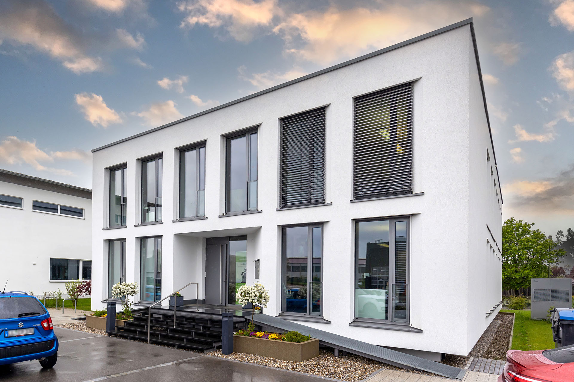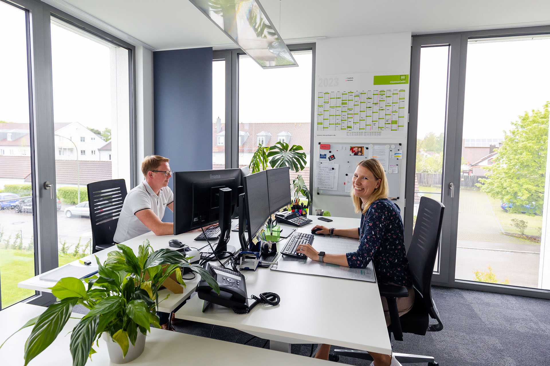 Bis 2018 arbeiteten wir in zwei getrennten Büros in der Landsberger Innenstadt. Irgendwann wusste man einfach nicht mehr, wer wo sitzt. Und es fühlte sich nicht mehr nach einem Team an. Deshalb haben wir 2018 ein komplett neues Bürogebäude in direkter Nähe zur A96 im Osten von Landsberg bezogen, das wir gemeinsam geplant haben. Alles wurde neu eingerichtet.